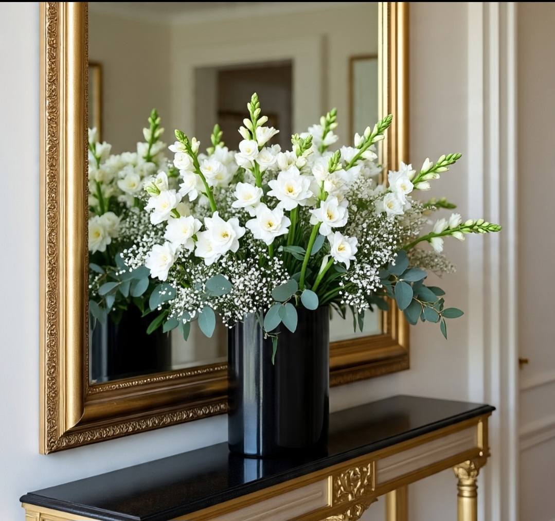 The Towering Gladiolus: In our larger arrangements, the verticality of the white gladiolus creates a sense of grandeur and height, making them perfect for foyers and high-ceiling spaces.